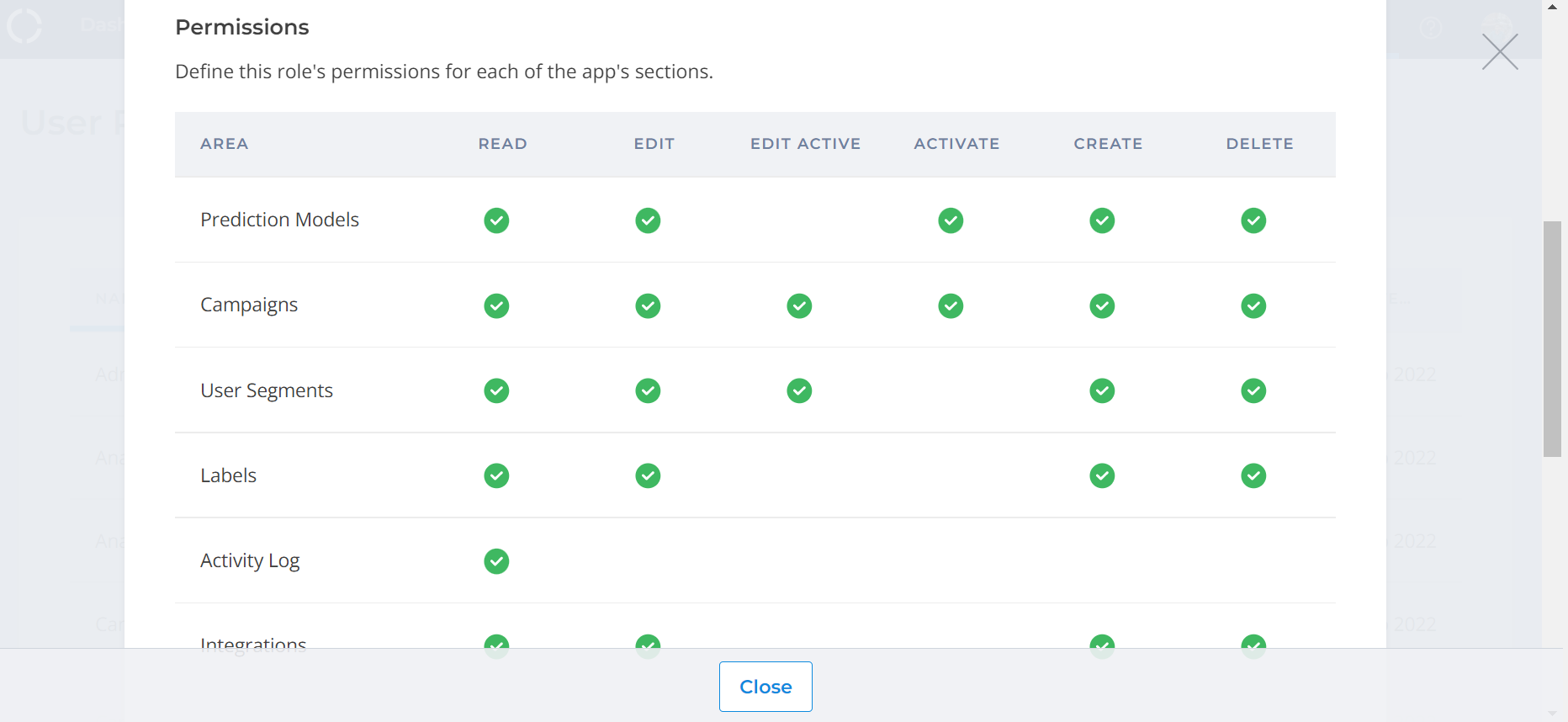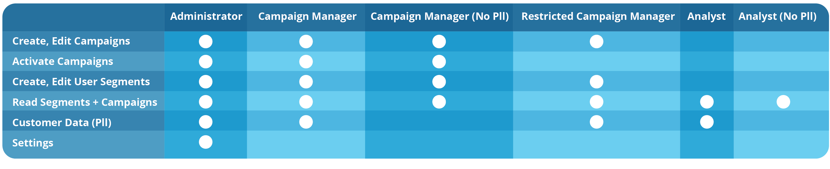 **Analyst** can read all campaigns and segments, but cannot edit or create them. This role is meant for users that are interested in performance and reporting, but do not need to set up campaigns or segments themselves.