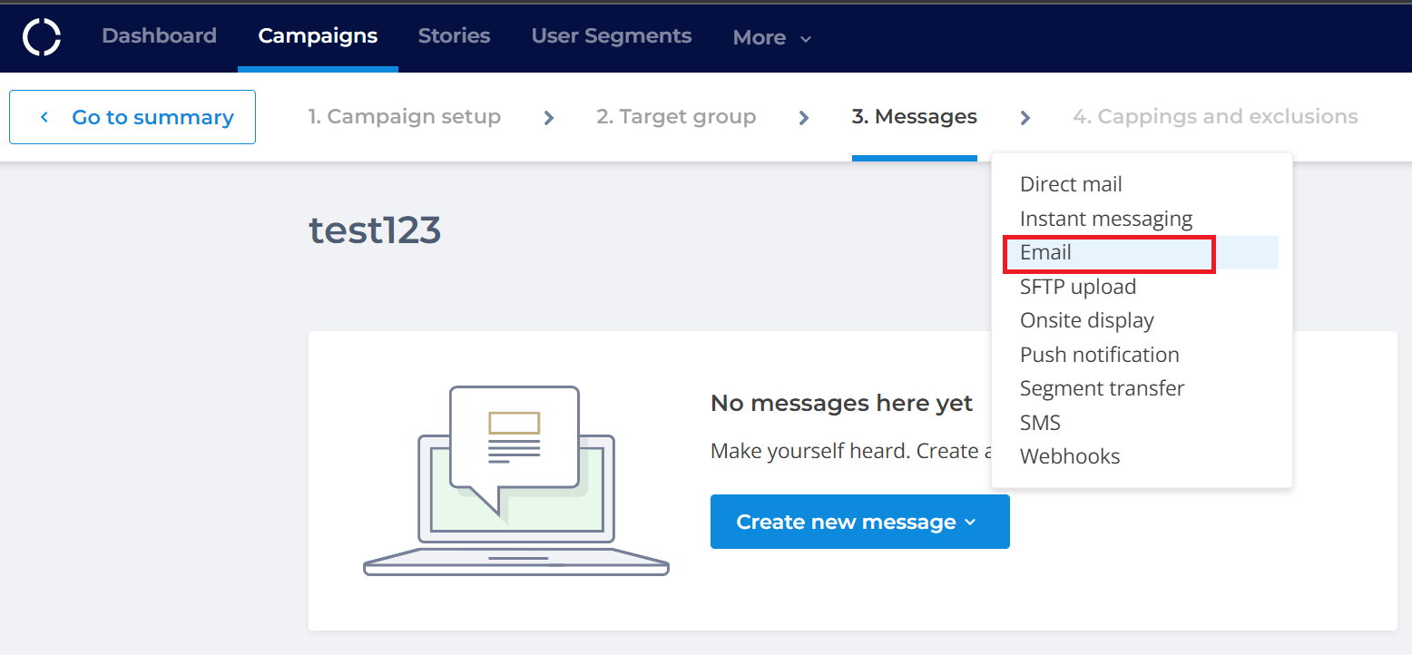 * Once you have created your campaign and filled in the “Campaign setup” and “Target group” sections, go to the `Messages` section and click `Create new message`.