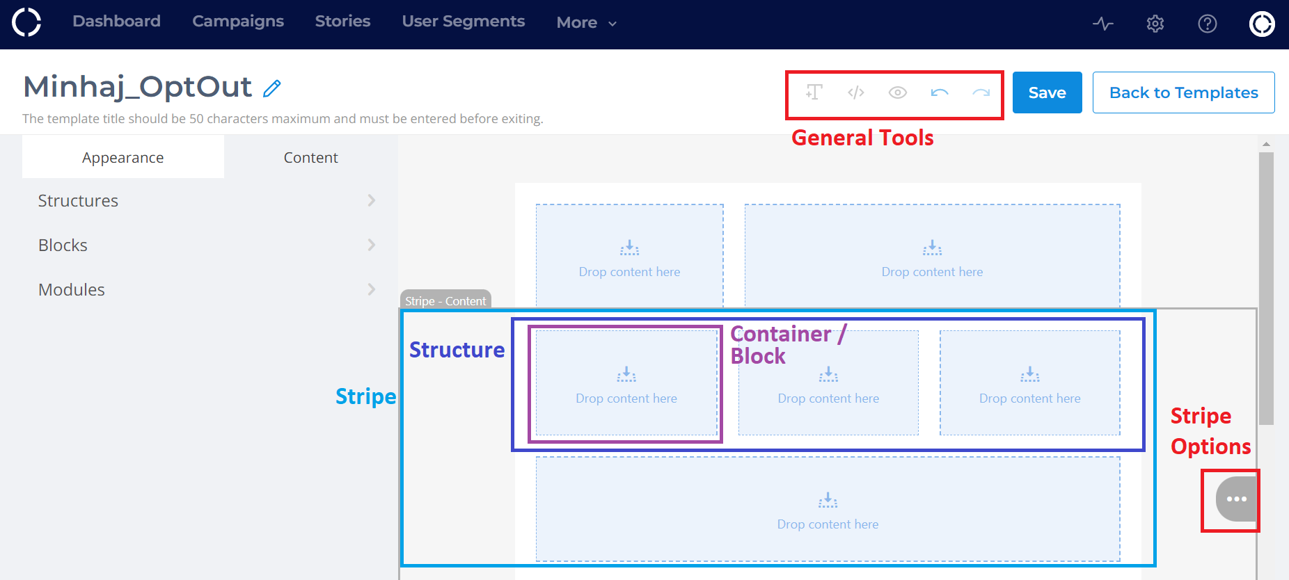 In CrossEngage, a Template contains parallel horizontal Structures that can be added or removed to change the length of the email. Each Structure contains one or more Containers. These Containers contain the contents of the email, such as Text, Images, Videos and more. By diving the Templates in Structures and Containers, we can easily set up and modify the Template. This also gives us the power to modify parts of the Template as independant units.