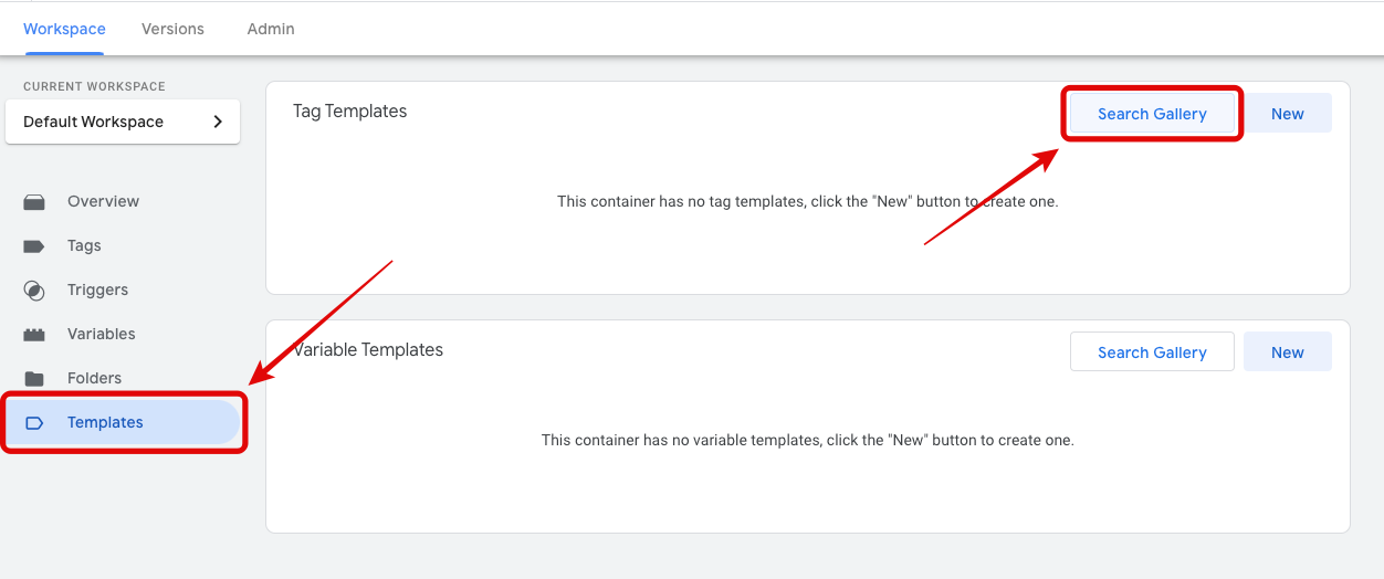 Choose the Templates section in the menu on the left. In the Tag Templates section you can now choose Search Gallery to import our tag template.