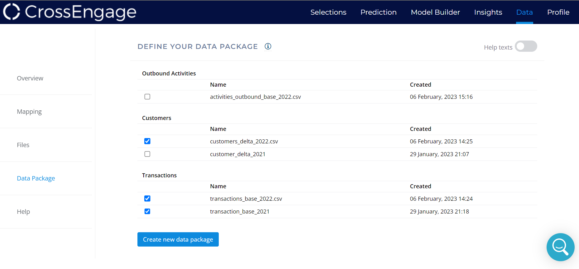 A data package is a combination of data files which provide a data foundation for a Campaign. For example, if a Campaign aims to select Customers from a certain group, these can be added to a Data Package, so Prediction Models can be created from it. All desired files that are to form the data foundation are transferred to the data package. These files usually provide the data foundation with the entire available history of transactions and activities and the current customer base.