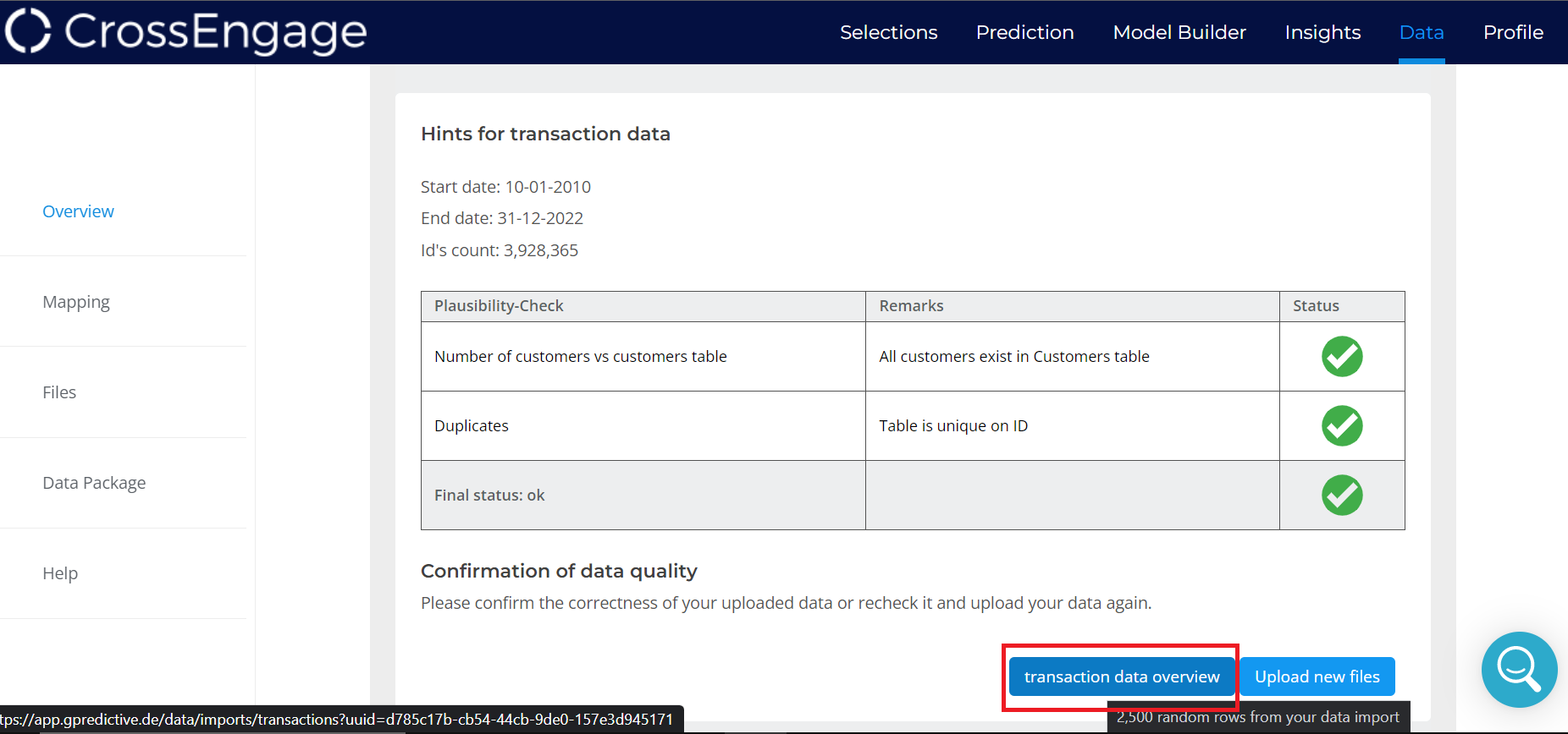 Below the graphs summarizing Customer / Transaction data, you can see a summary of the quality of the data, and warnings/error if any. To see a Sample of the Customer / Transaction Data, click on " Customer / Transaction Data Overview" at the bottom of the report.