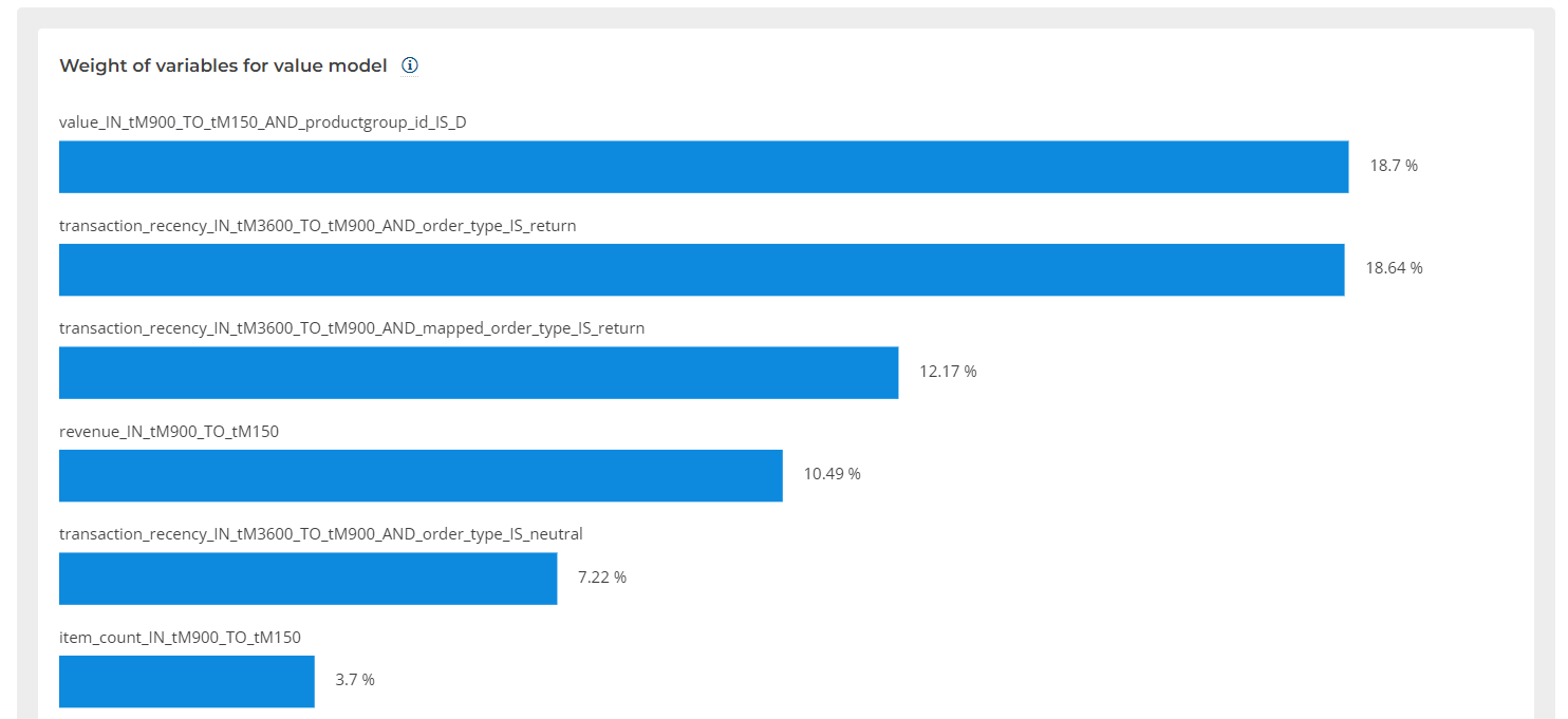 Here you can see a list of features for this model. In this example, the top 6 features combined provide roughly 2/3rds of the predictive power of the model.