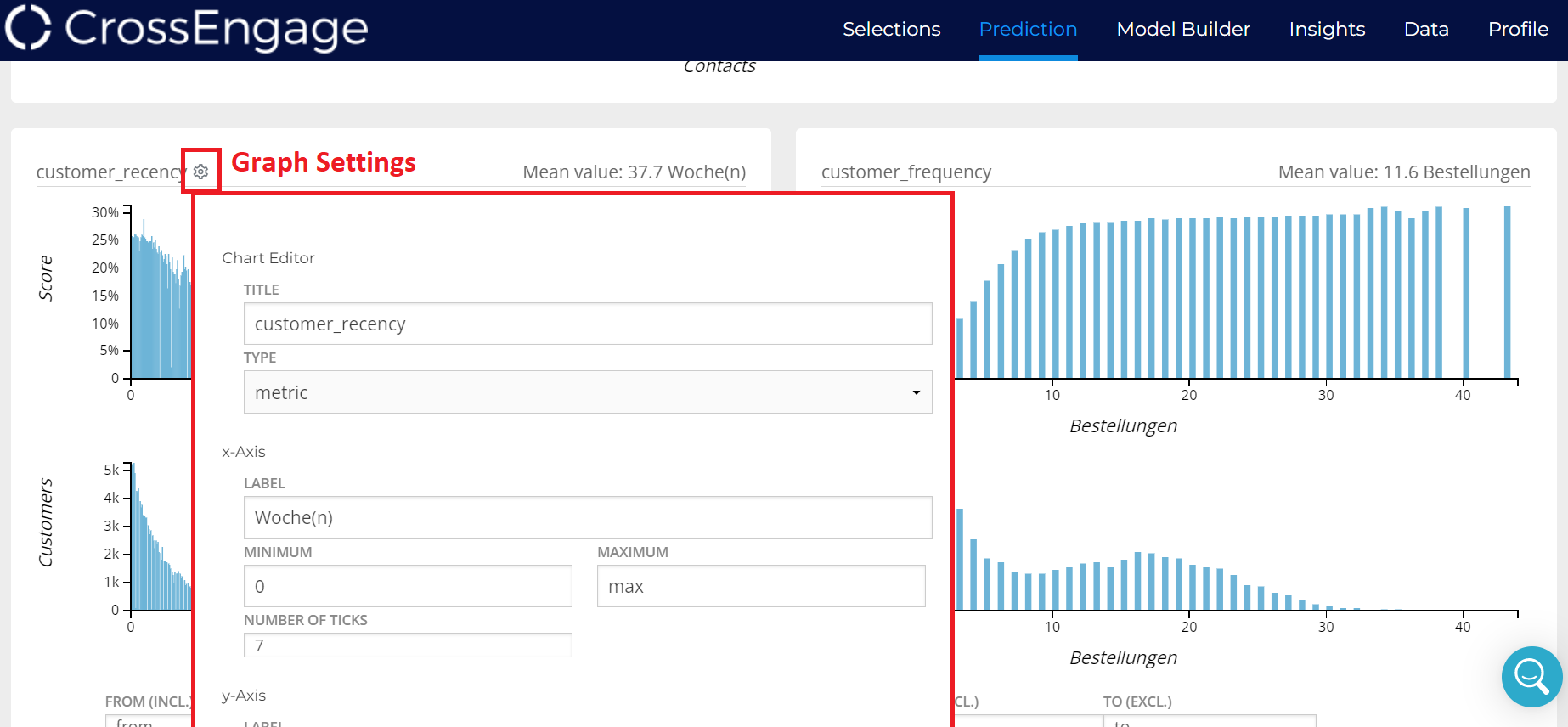 Below the Prediction graph, there are 5 other graphs detailing the main features of this Selection. Hover your mouse over the Title of any of the Graphs, to see the Graph Settings button. Click on the Graph Settings button of any graph to modify it. In the Graph Settings, you can change the Graph Title, the Labels for X-axis and Y-axis, or change the number of ticks to be shown.