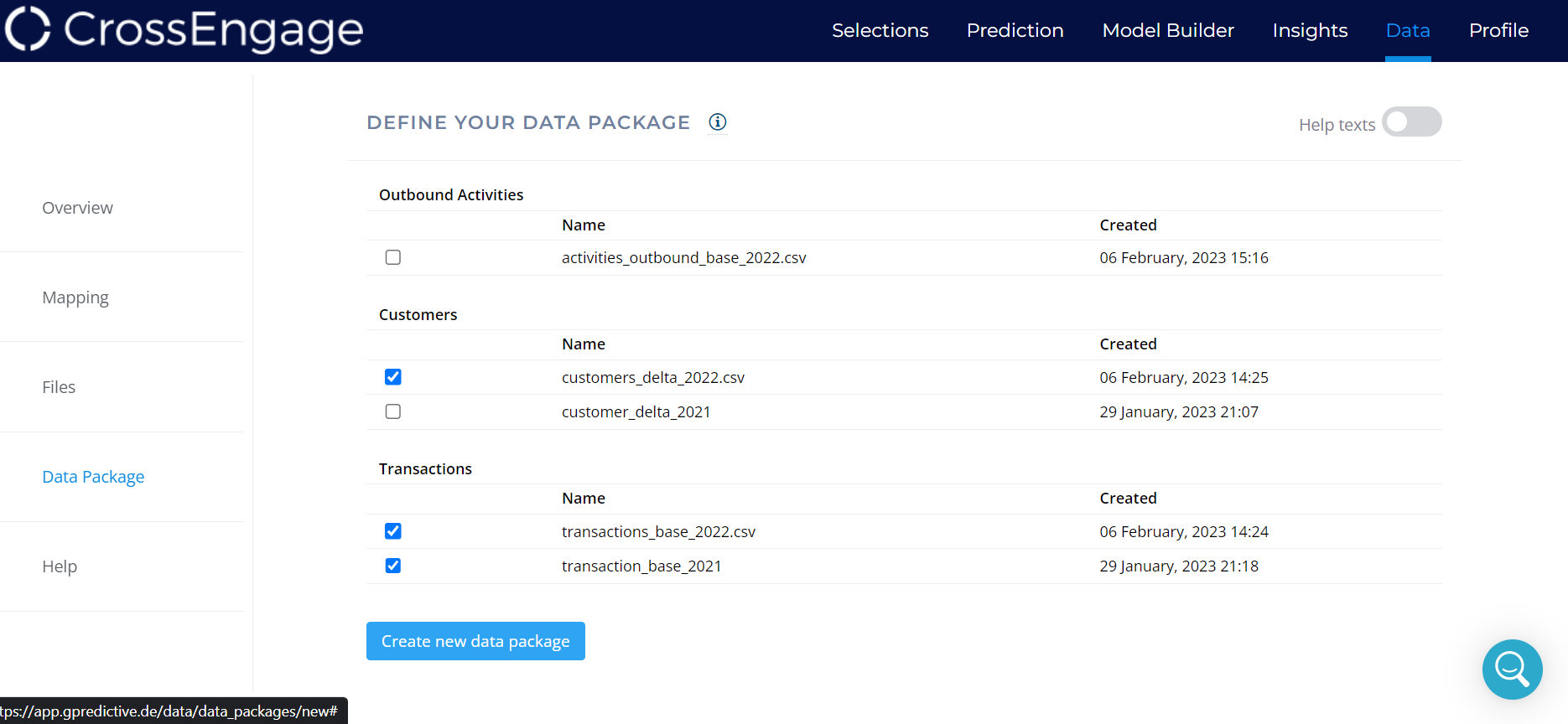* Choose all relevant files for the current Campaign. Generally, all BASE files (transactions & activities) should be added to every data package as this data can help build more accurate models. Also select the Customer file, containing the Customers that you wish to add to this Campaign.